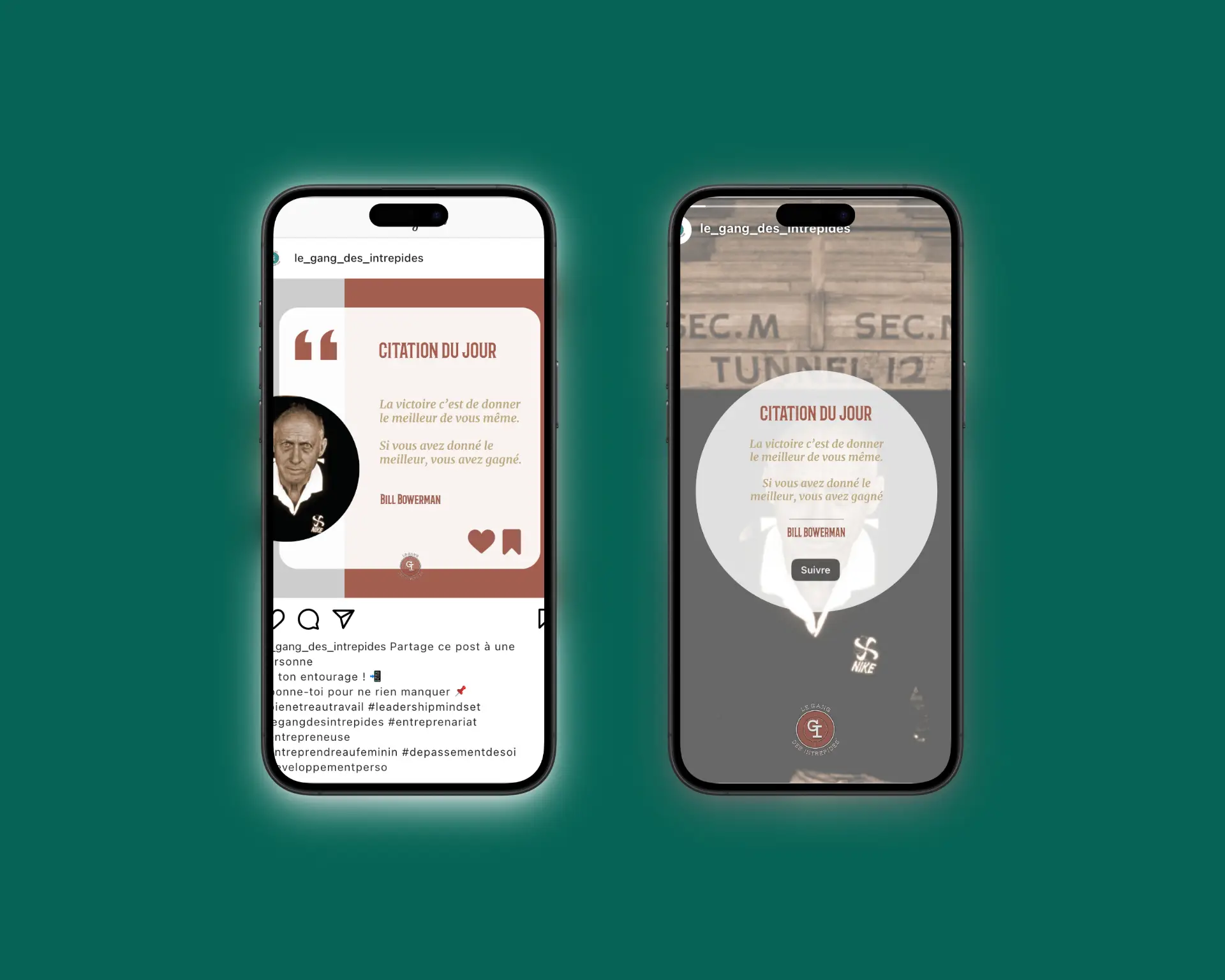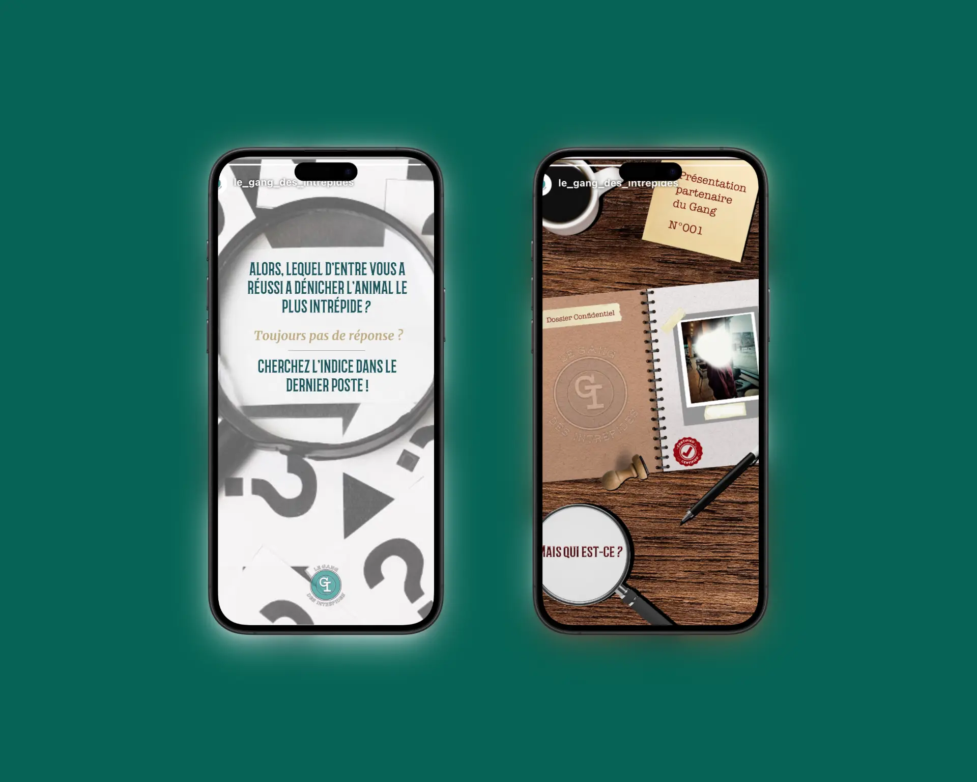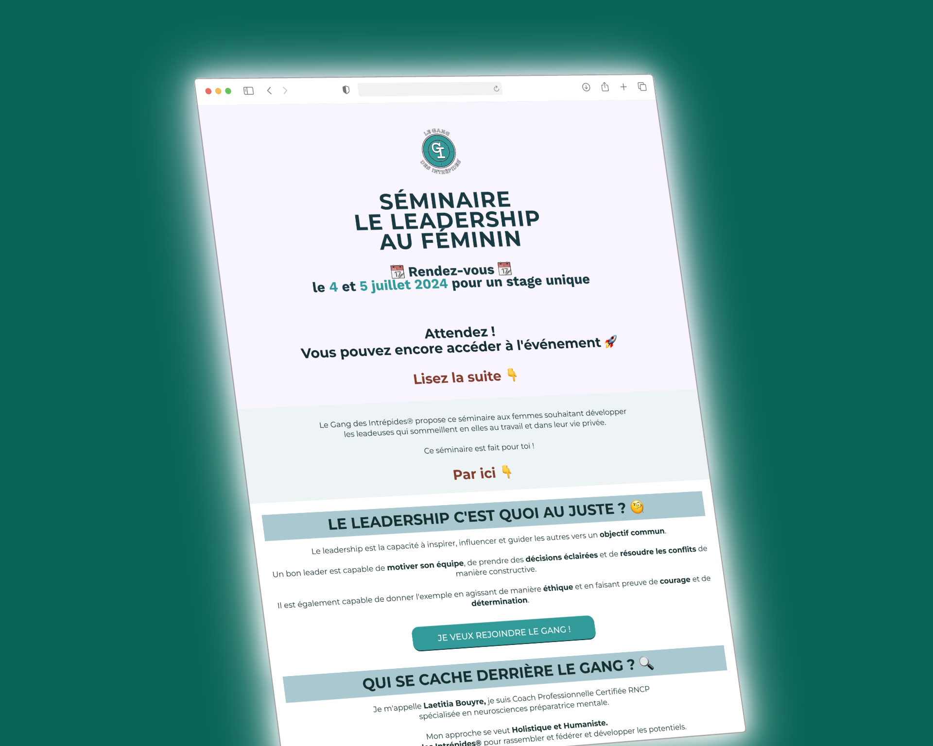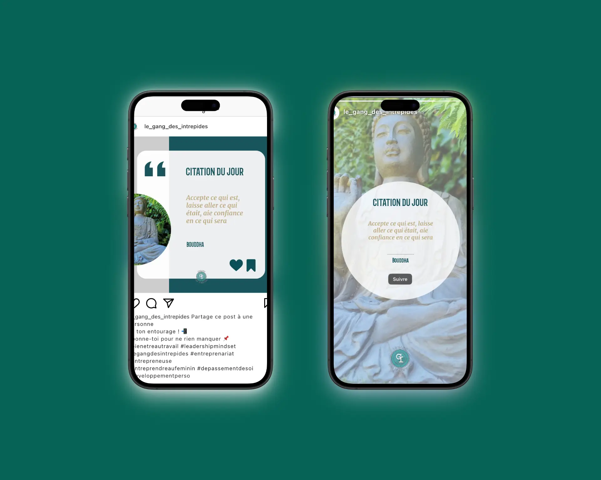 Un logo rond et épuré, mettant en avant les initiales « GI » au centre d’un cercle turquoise foncé, symbolisant calme et confiance, entouré du nom « Le Gang des Intrépides » en typographie audacieuse, renforçant l’identité et l’appartenance à la communauté, avec une cible en arrière-plan en forme de rond, symbolisant la précision et la détermination.